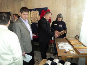 В фойе ДК «Современник» в праздничный день была организована выставка декоративно-прикладного искусства, где демонстрировали свои таланты и способности люди с ограниченными возможностями здоровья. На выставке были представлены всевозможные изделия из бисера, макраме, соломки, аппликации, резьбы по дереву, вышивки.