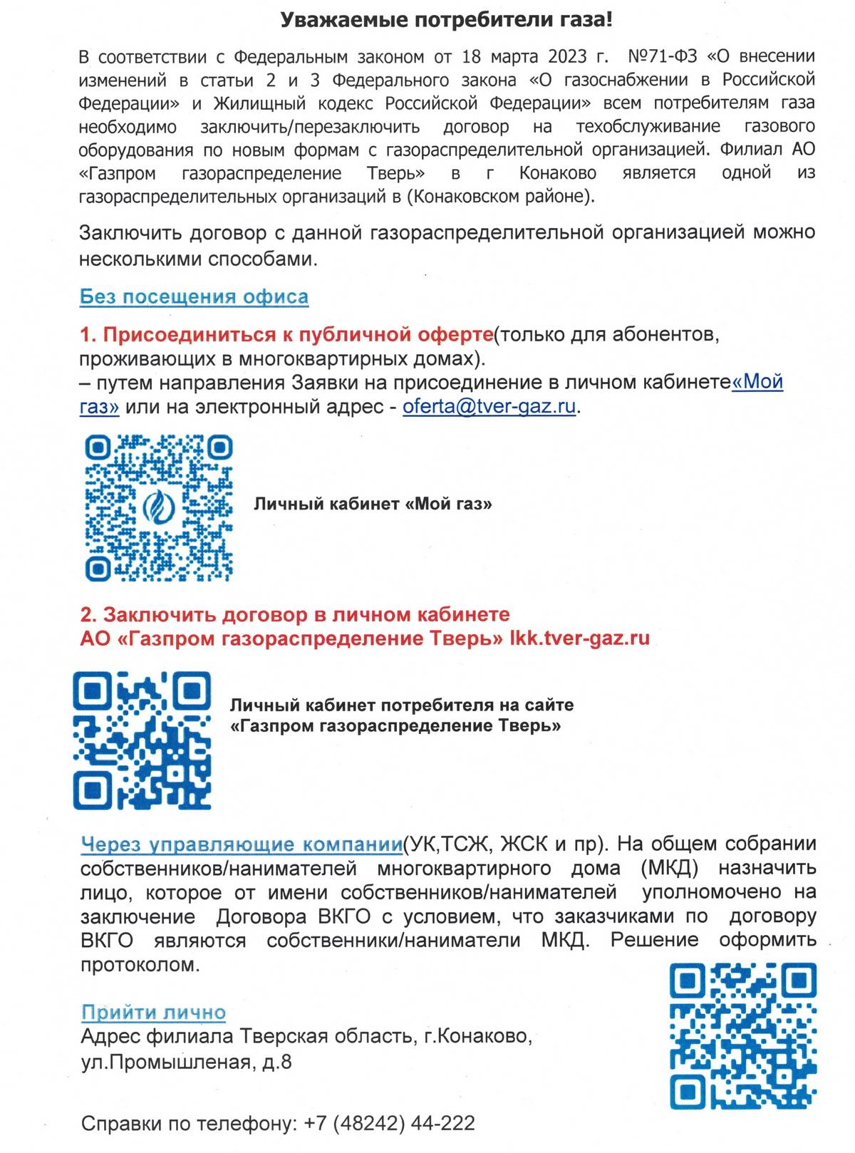 В соответствии с Федеральным законом от 18 марта 2023 г. №71-ФЗ «О внесении изменений в статьи 2 и 3 Федерального закона «О газоснабжении в Российской Федерации» и Жилищный кодекс Российской Федерации» всем потребителям газа необходимо заключить/перезаключить договор на техобслуживание газового оборудования по новым формам с газораспределительной организацией. Филиал АО «Газпром газораспределение Тверь» в г. Конаково является одной из газораспределительных организаций в Конаковском районе.