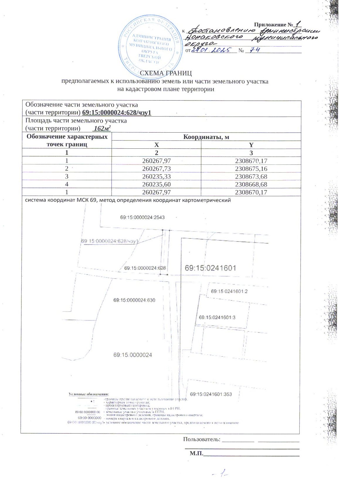 - части земельного участка с кадастровым номером 69:15:0000024:628/чзу1 площадью 162 кв.м. (приложение № 1 на 1 листе),