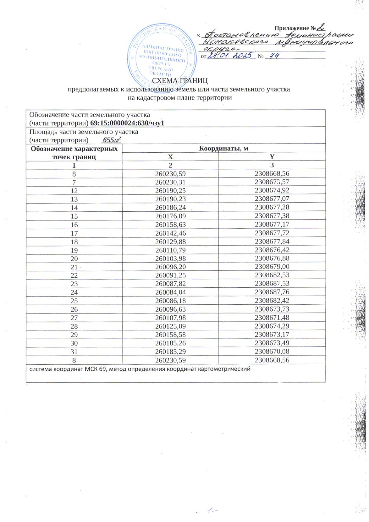 - части земельного участка с кадастровым номером 69:15:0000024:630/чзу1 площадью 655 кв.м.(приложение № 2 на 2 листах),