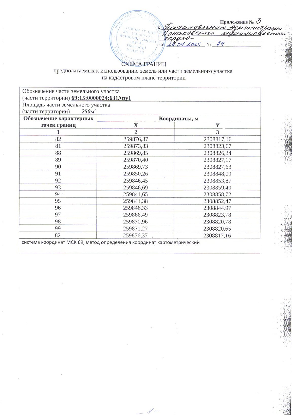 - части земельного участка с кадастровым номером 69:15:0000024:631/чзу1 площадью 250 кв.м. (приложение № 3 на 2 листах),