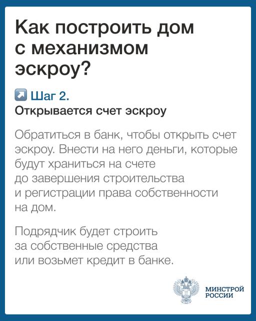 Федеральным законом от 22.07.2024 № 186-ФЗ «О строительстве жилых домов по договорам строительного подряда с использованием счетов эскроу», установлен механизм применения счетов эскроу при строительстве жилых домов по договорам строительного подряда. Министерство Тверской области по обеспечению контрольных функций в целях повышения осведомленности граждан об установлении механизма предлагает ознакомиться вас с информационными материалами на эту тематику, подготовленные Минстроем России.