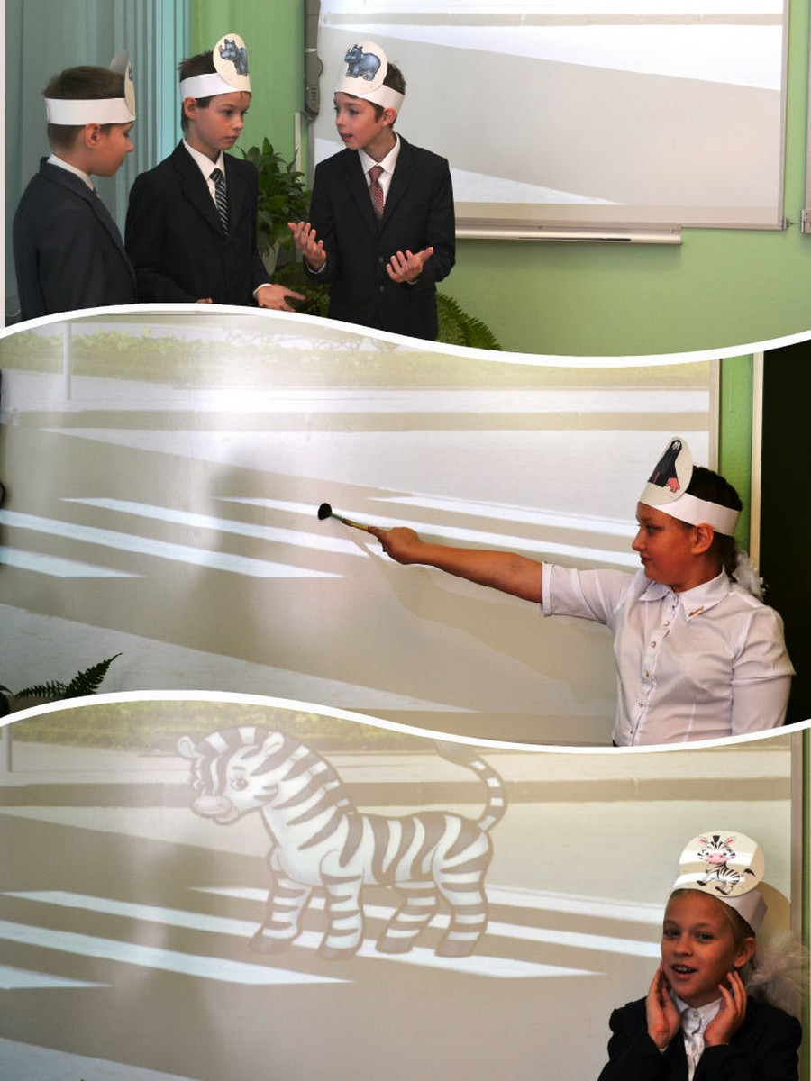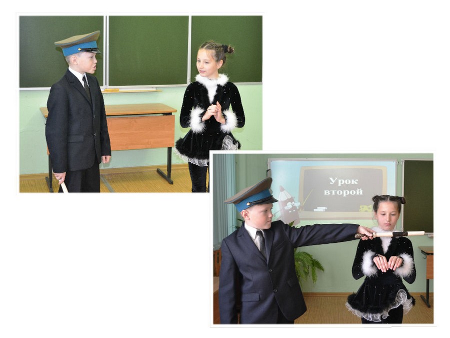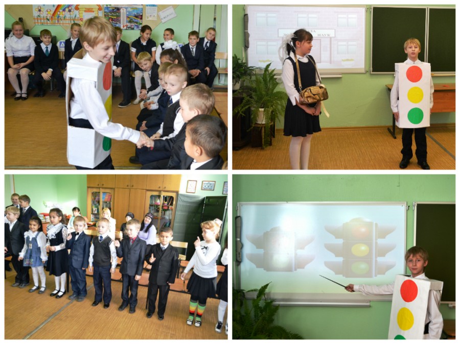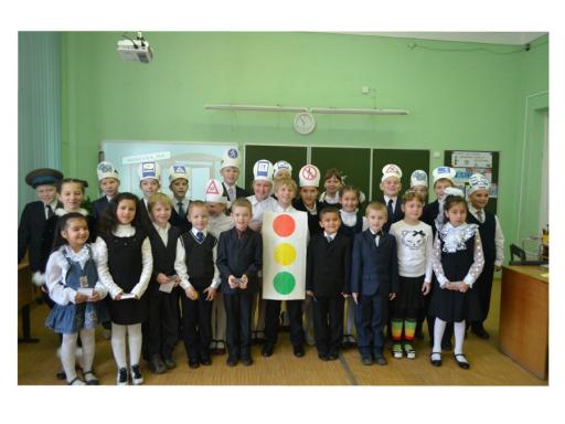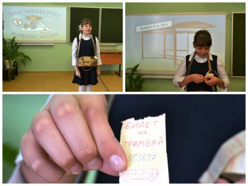 На урок в первый класс заглянул кондуктор трамвая, который пригласил ребят в Школу дорожных наук. Чтобы войти в трамвай, первоклассники должны были рассказать правила поведения пассажиров в транспорте.